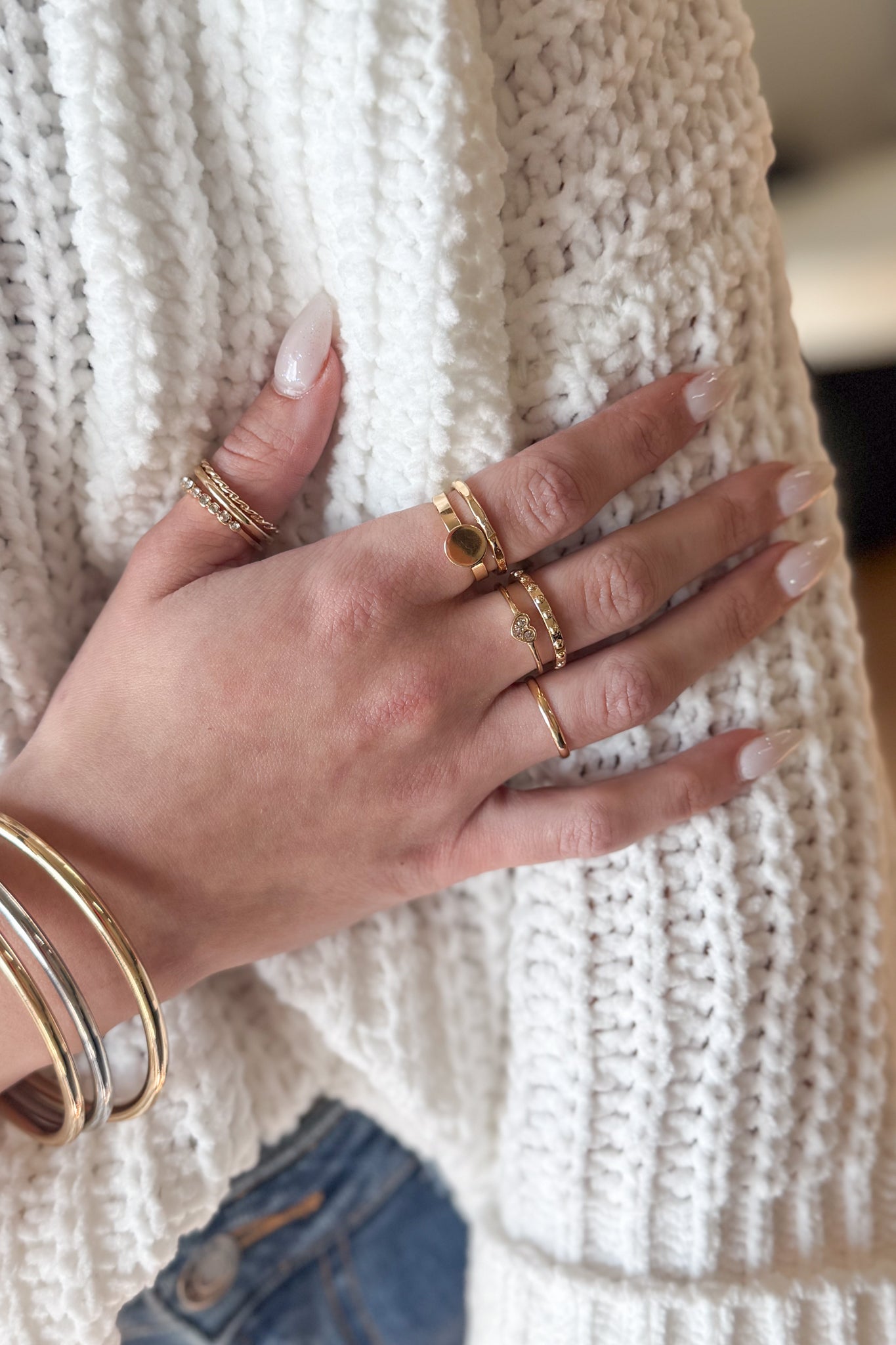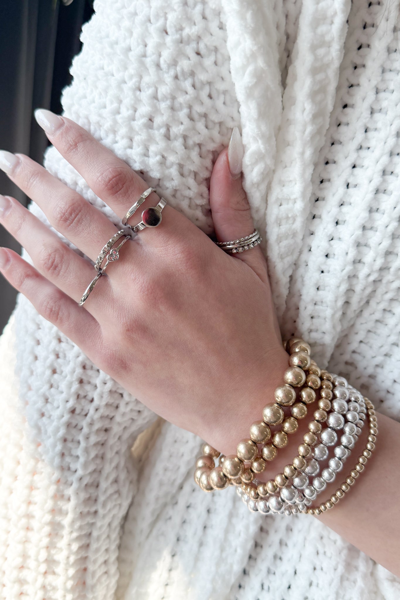 "Complete your look with our Perfect Ring Stack! Made of both gold and silver, this stack adds a touch of elegance and versatility to any outfit. Mix and match to create endless styles. Perfect for any fashion-forward customer seeking a unique and trendy accessory."
