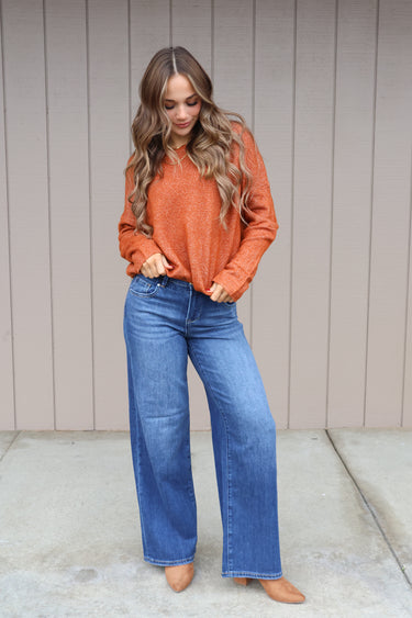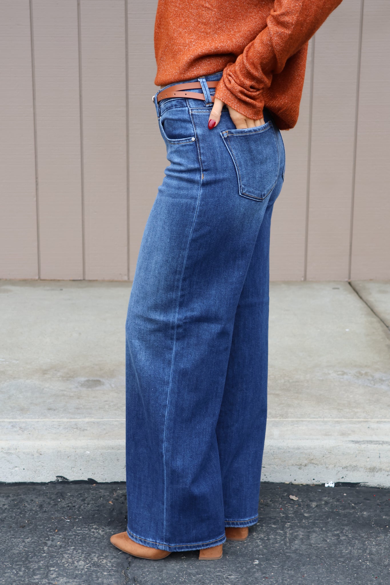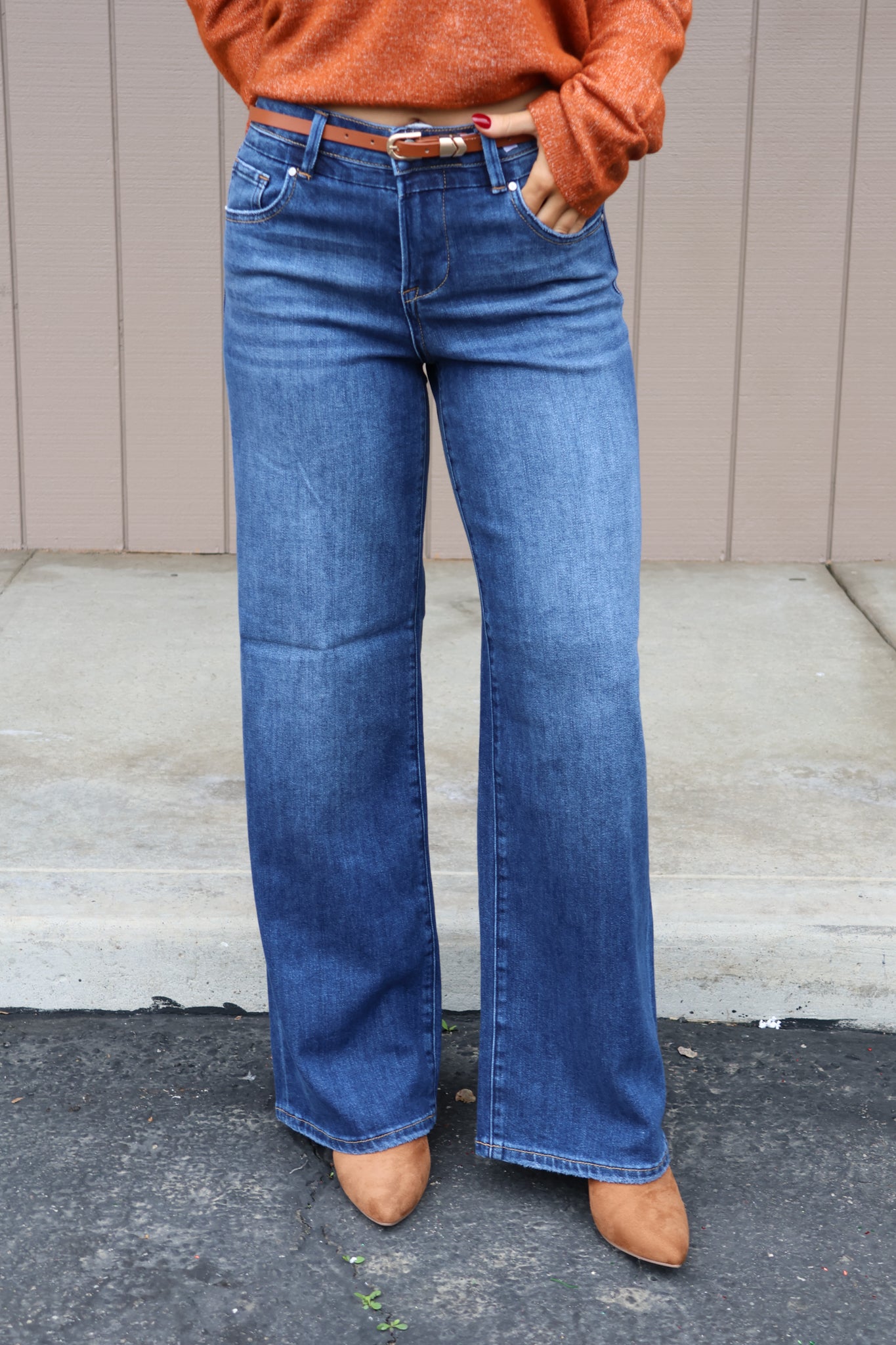 Introducing the Amelia Jeans—your new go-to for effortless cool. These dark wash beauties feature a flattering mid-rise cut with a relaxed wide-leg silhouette and straight hem that works with everything in your closet. Crafted from soft, lightweight material, they're comfortable enough for all-day wear without the bulk. Whether you're dressing them up or keeping it casual, the Amelia delivers that perfect balance of style and ease. Get ready to live in them.