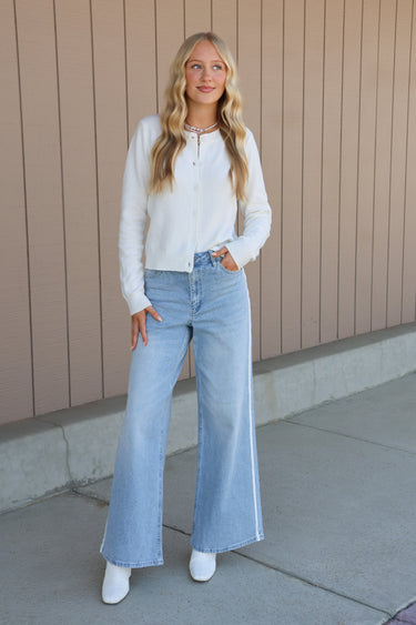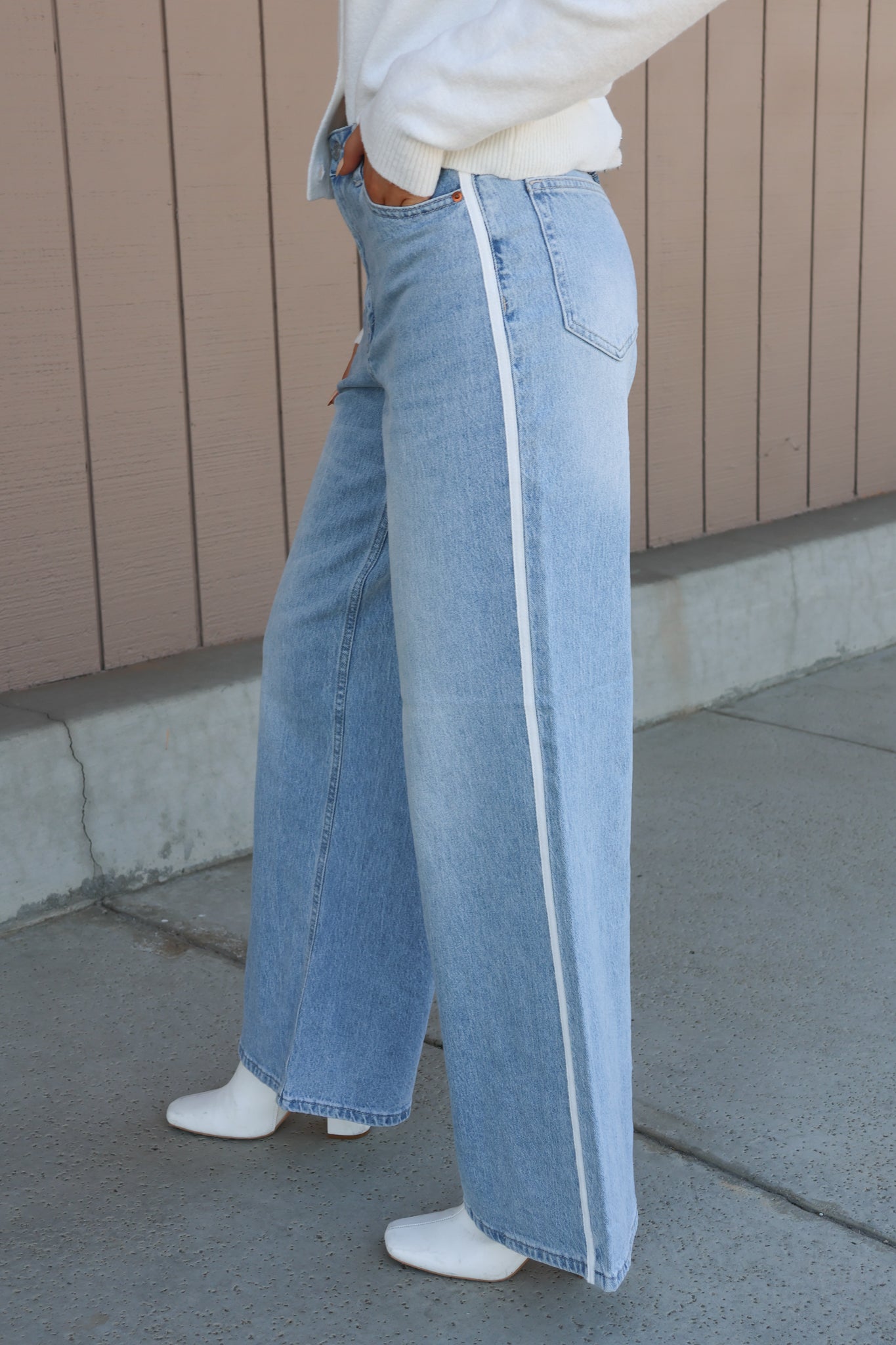 Step up your denim game with our Haisley Jeans, the perfect blend of sporty and chic. Featuring a flattering high-rise fit, relaxed wide leg silhouette, and bold white side stripe detail, these jeans give your everyday look an instant style upgrade. The light wash denim makes them easy to pair with everything from cozy knits to graphic tees, while the wide leg cut keeps the vibe trendy and effortless.