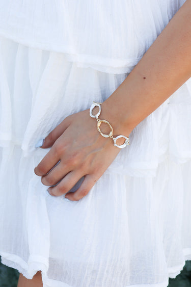 Be in the moment with this playful bracelet - literally. Featuring a mix of gold and silver, this smashed bracelet adds a quirky touch to any outfit. Perfect for those who don't take themselves too seriously.