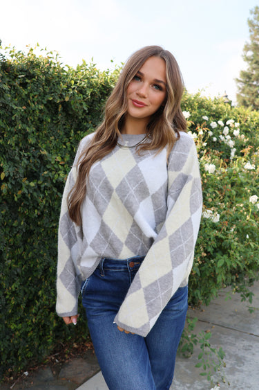 Channel timeless prep and cozy charm with our Blair Argyle Sweater — the perfect mix of classic and cute. This soft knit round-neck sweater features a neutral argyle pattern in shades of beige, ivory, and a soft buttery yellow, giving it that elevated, vintage-inspired look.