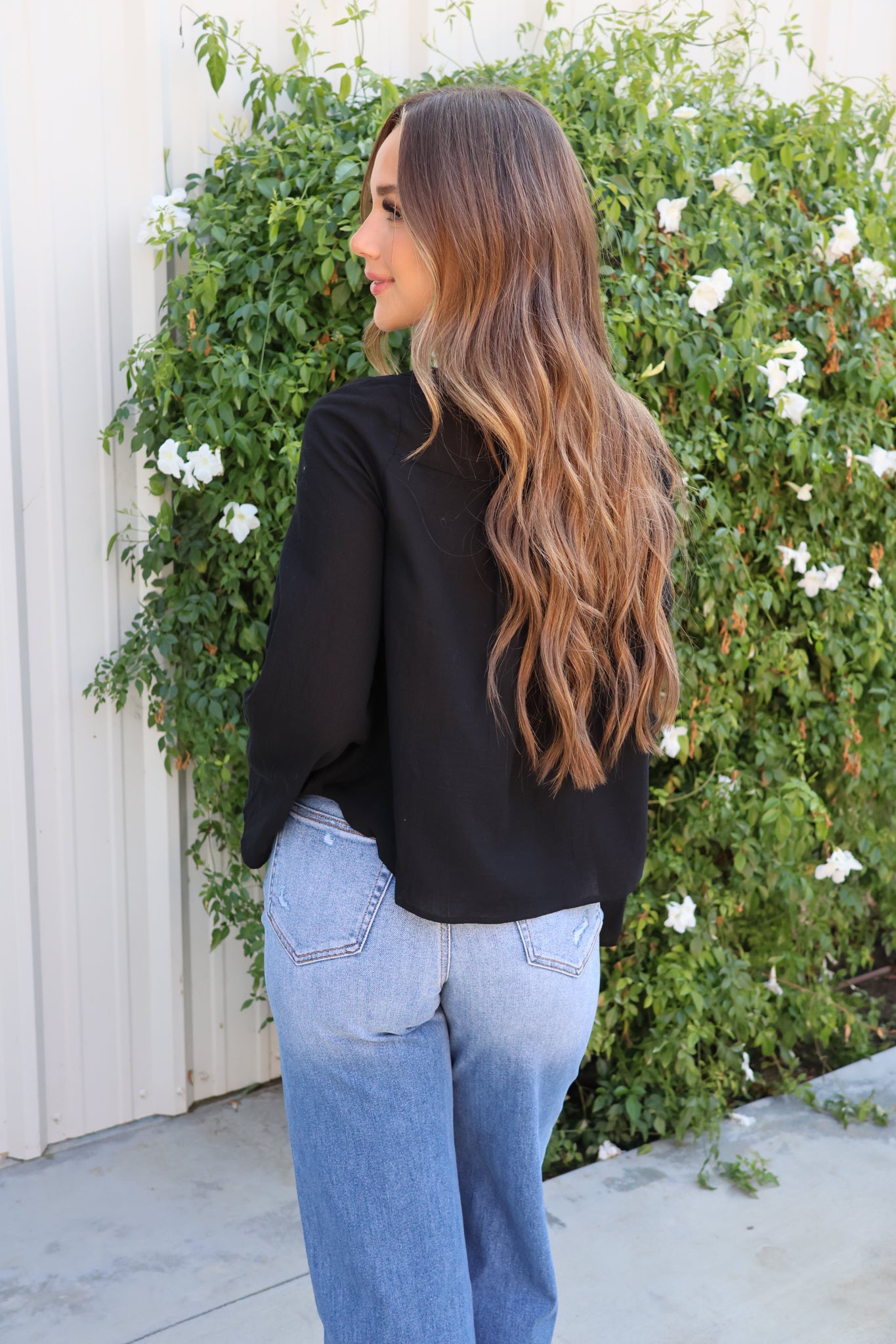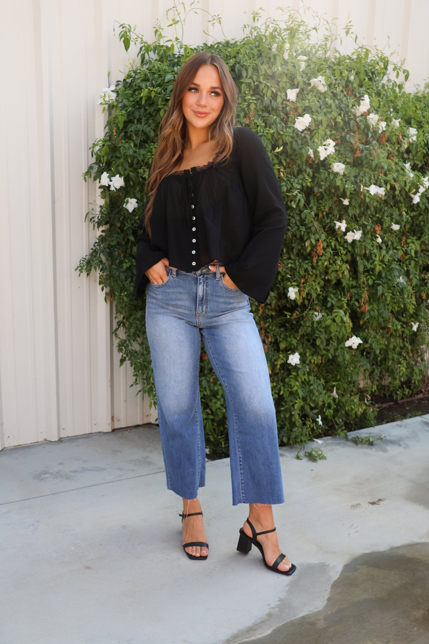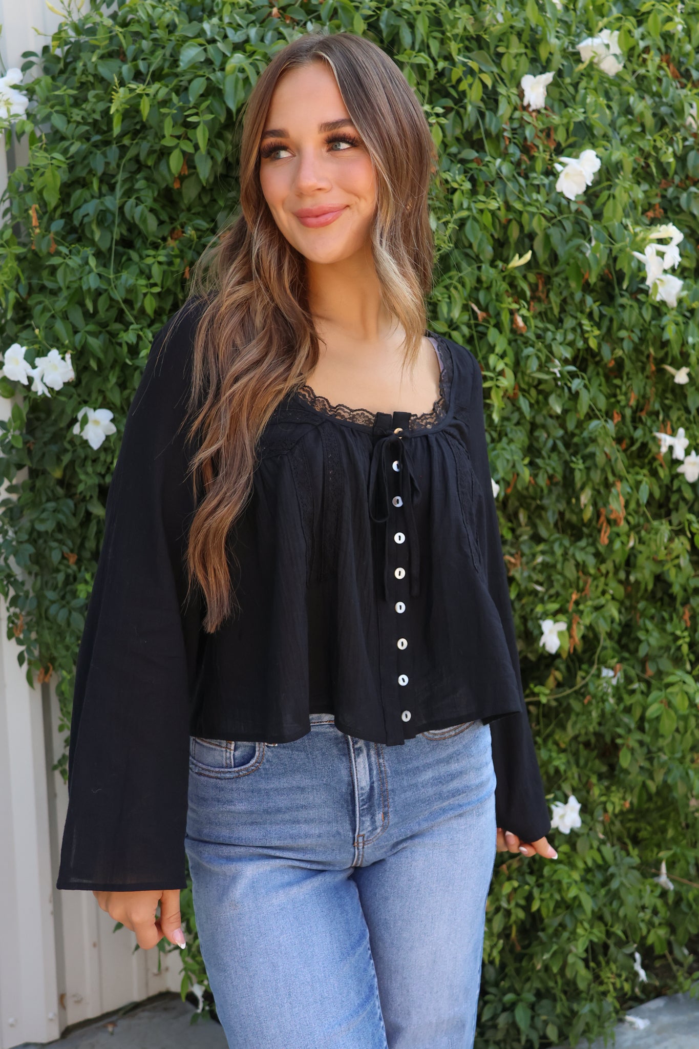 Channel timeless romance in our Midnight Prairie Lace Top. Featuring a flattering scoop neckline, delicate lace detailing, and covered button front, this linen-inspired blouse brings vintage prairie vibes with a modern twist. The subtle bell sleeves add just the right amount of drama, while the breathable fabric makes it perfect for layering through every season. Pair with denim for a casual boutique look or style it with skirts and boots for a chic fall outfit.