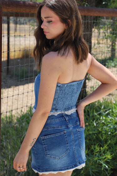 Introducing the Kick the Dust Up Top! This gorgeous denim strapless top is lined with delicate lace, adding a touch of romantic charm to your outfit. Perfect for a night out or a casual day, this top will enhance your look with its stylish and feminine design.