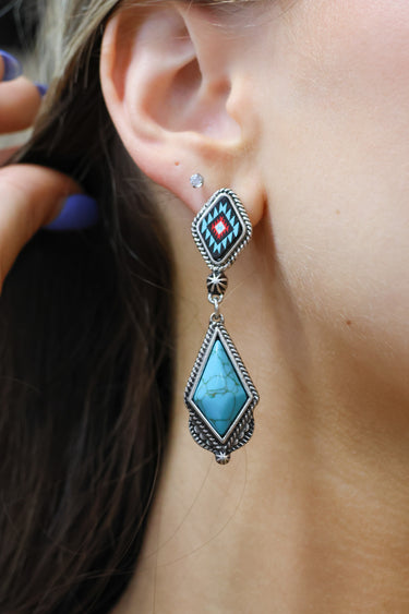 Add a touch of wild west charm to your outfit with our Revival Earrings! The silver and turquoise dangle earrings are a stylish accessory for any cowgirl or cowboy. Bring out your inner rodeo star with these unique and playful earrings.