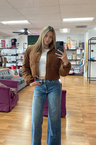 Introducing the Apres Ski Puffer Jacket, a must-have for your winter wardrobe. This cute and cozy puffer jacket features unique corduroy detailing, adding a touch of style to its functionality. Stay warm and fashionable all season long.