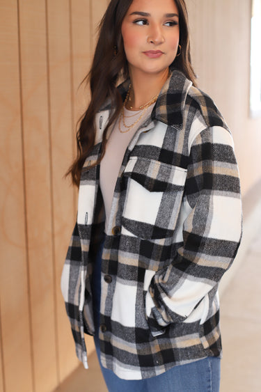 Stay effortlessly chic this season in our oversized plaid shacket featuring a mix of neutral black, tan, and ivory tones. With a soft brushed feel, button-up front, and roomy fit, it’s the perfect layering piece for chilly mornings and cozy nights. Pair it with denim and sneakers for a casual vibe, or throw it over a sweater dress and boots for a fall-ready look.