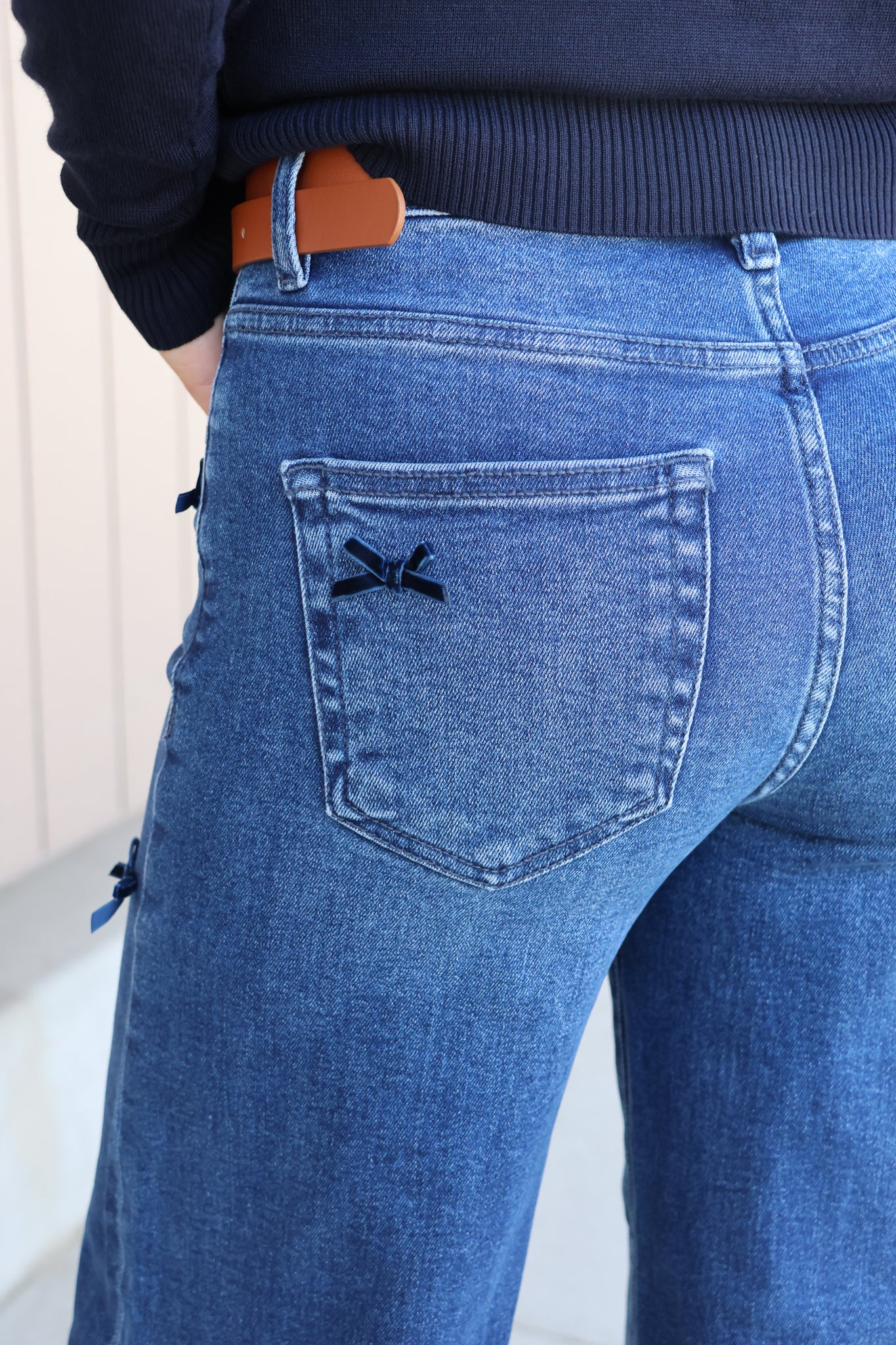 Our Bowie Jeans take your denim game to the next level with their playful yet polished details. Crafted in a flattering fit, these jeans are finished with luxe navy velvet bows that add just the right touch of girly charm. Perfect for dressing up with heels and a silky top or keeping it casual with sneakers and a tee—these jeans are your new go-to for making everyday feel special.
