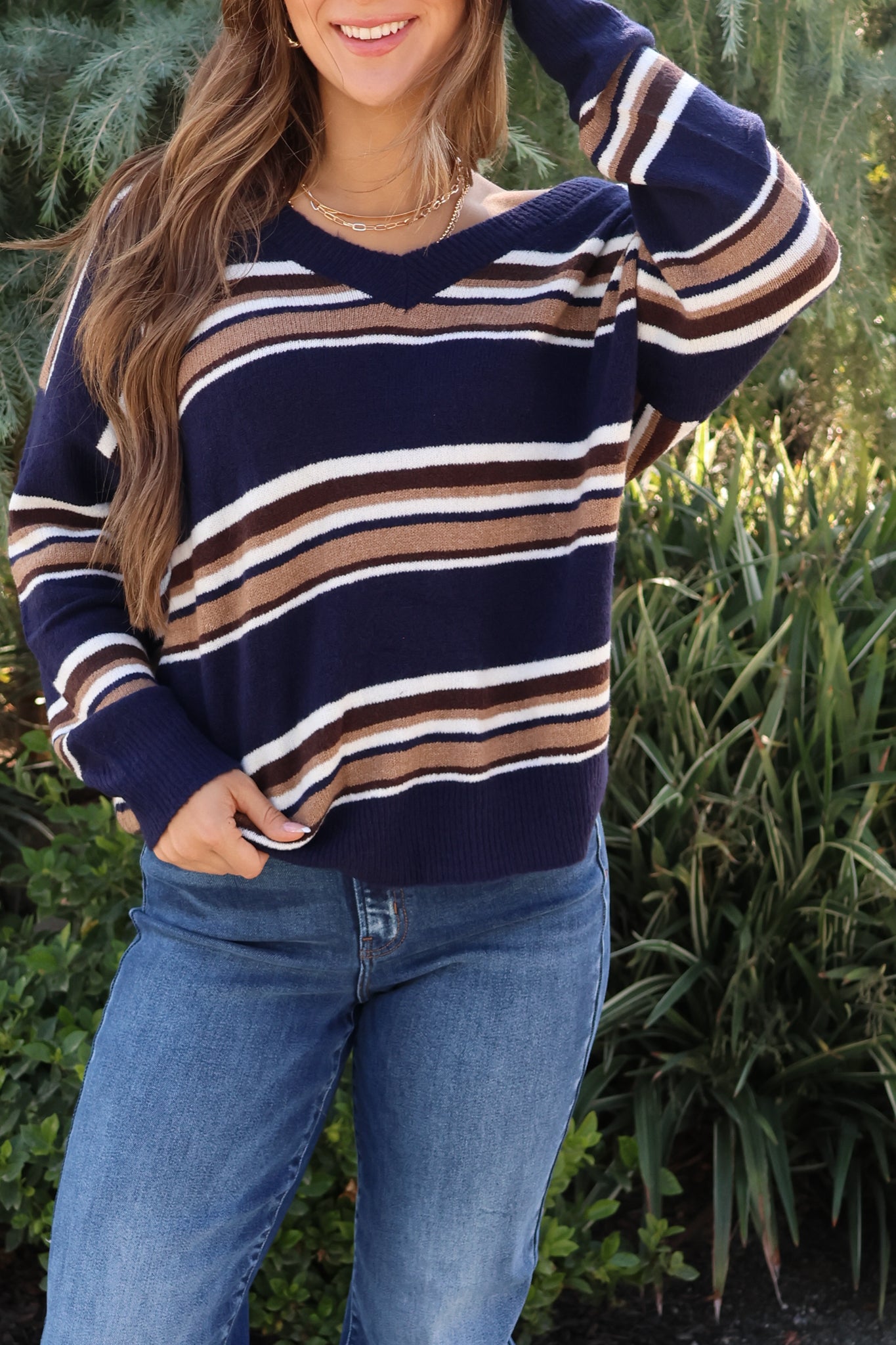 Meet your new favorite fall knit — the Hampton Stripe Sweater. This effortlessly chic v-neck sweater features a classic mix of navy, tan, and multi-color stripes, giving it that timeless yet trendy coastal vibe. The soft knit fabric keeps you cozy while the relaxed fit and flattering neckline make it perfect for layering or wearing on its own.
