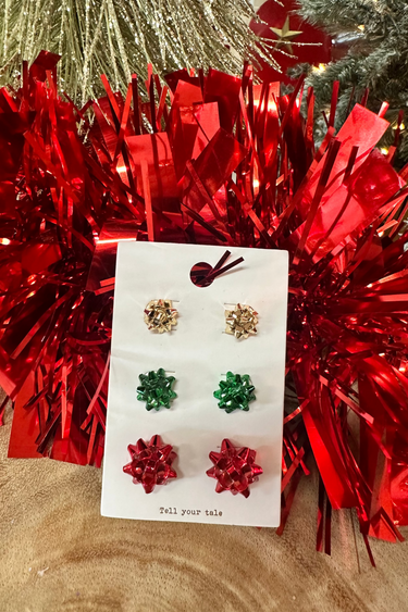 Add the cutest pop of holiday cheer to your look with our Holiday Bow Stud Trio. This set includes three festive pairs — shimmering gold, merry green, and classic Christmas red — each shaped like a tiny present bow for the perfect dose of seasonal sparkle.