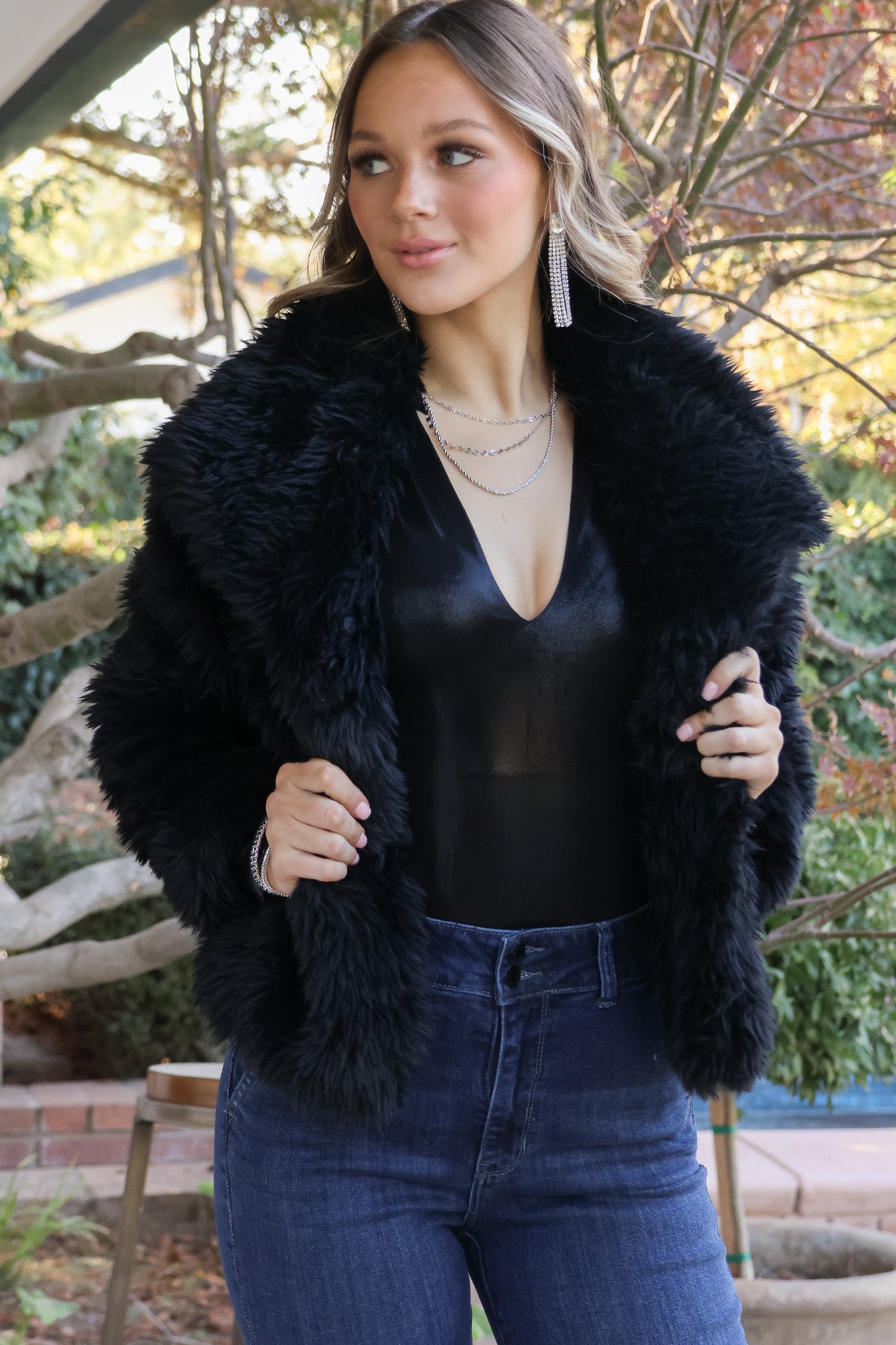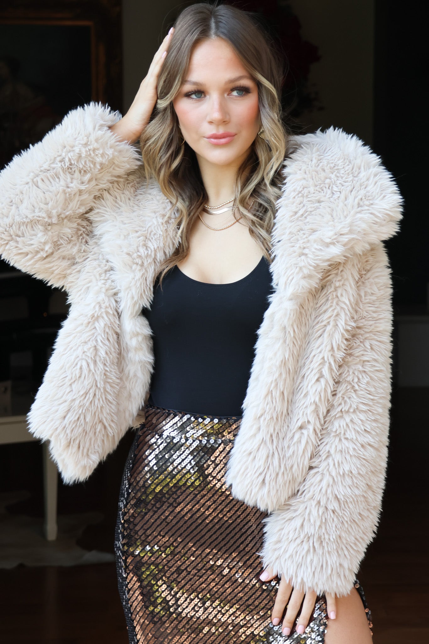 Look festive and fabulous in this shaggy faux fur Holiday Nights tan jacket. Its chic style will have all your friends exclaiming, “ now that’s one fashionable coat!” Own the night and the season with this eye-catching piece! Runs True to Size