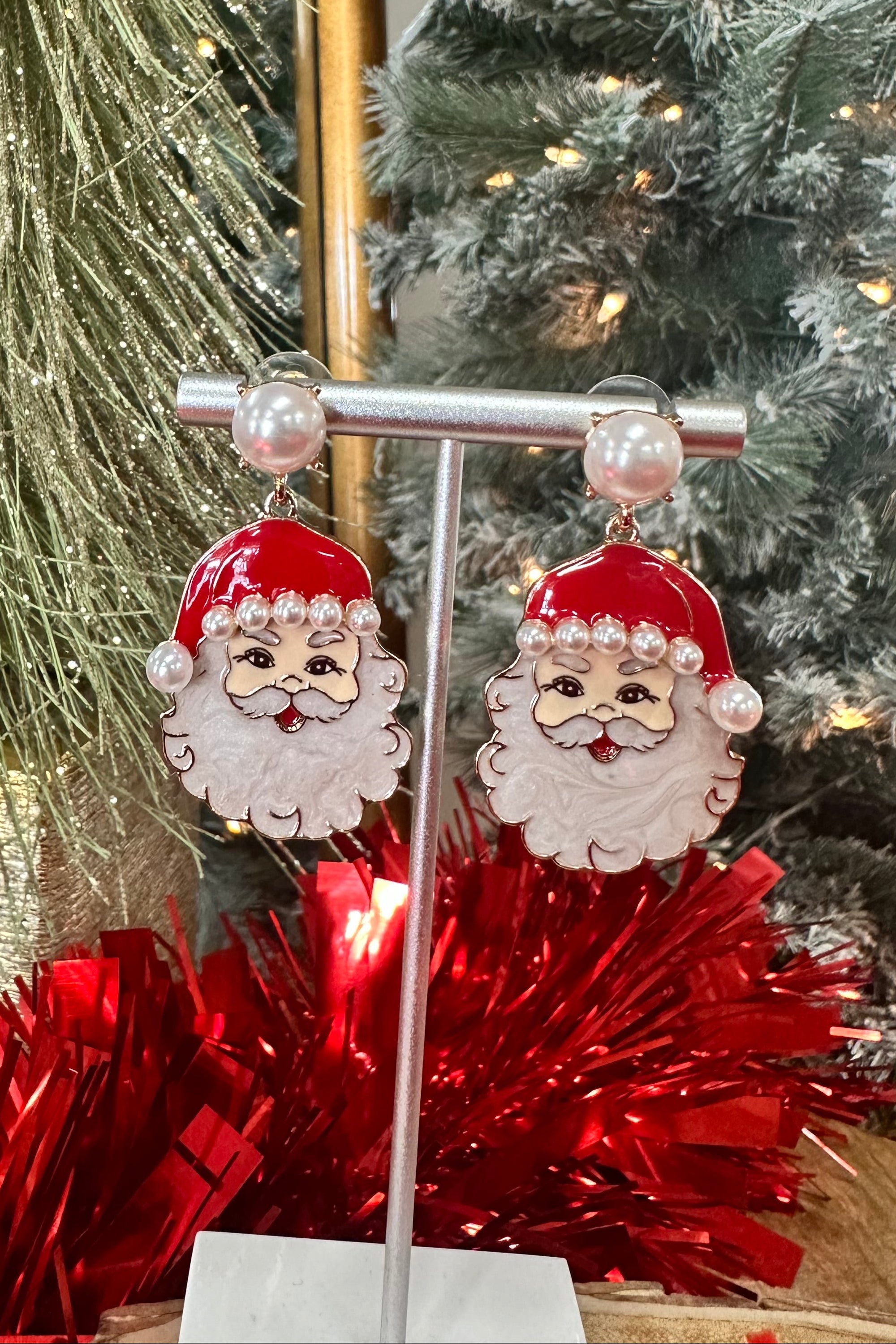 These festive Santa dangle earrings, add a cheerful touch to any holiday outfit each earring features a detailed Santa face with a bright red hat accented by a row of delicate pearls plus a larger, pearl stud at the top for added elegance the tone outlining enhances the classic colors creating a charming blend of playful and perfect for holiday parties!