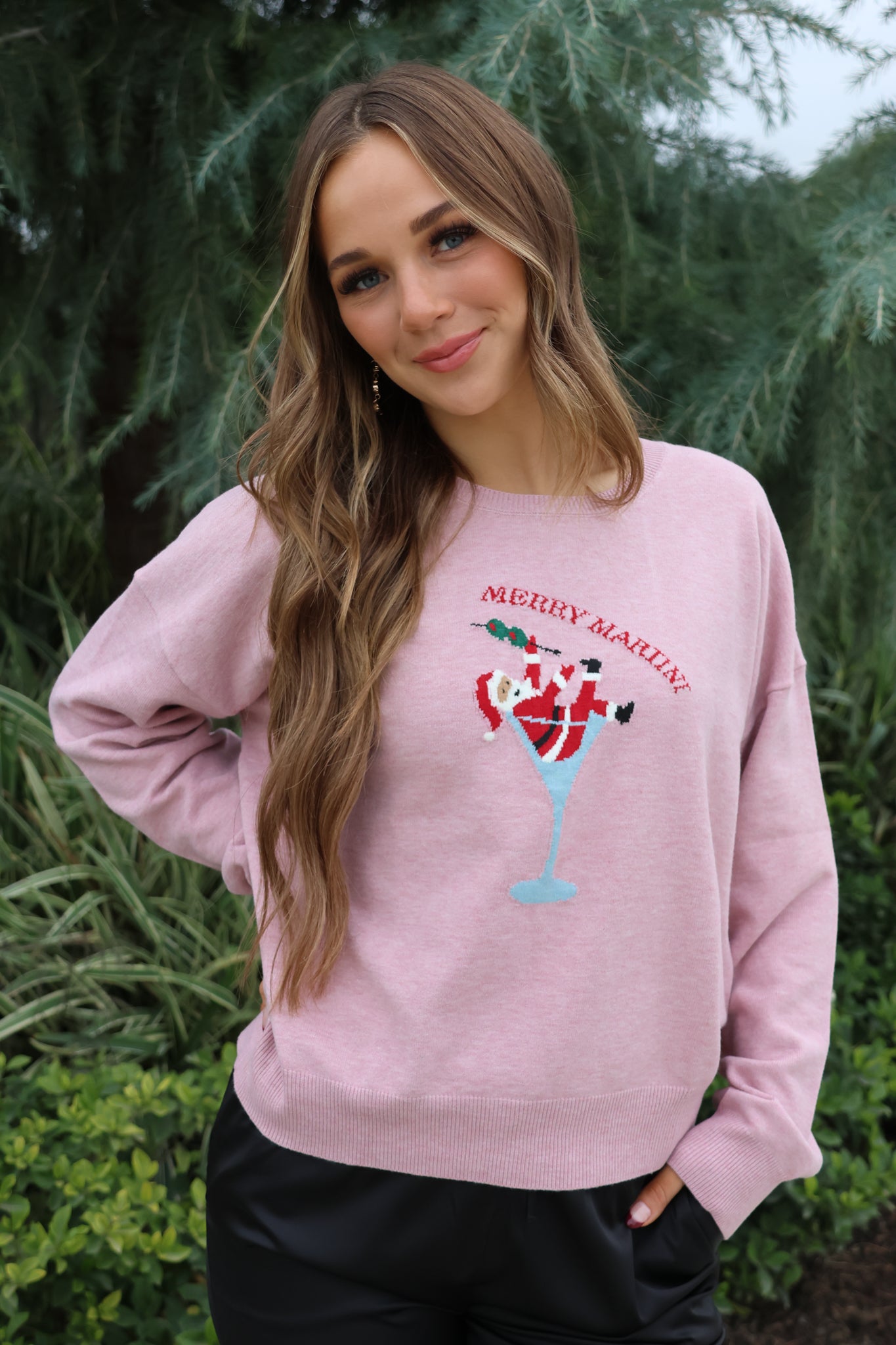 Get in the holiday spirit with our Merry Martini Sweater — the cutest festive piece your closet needs this season! This soft pink knit sweater features a playful embroidered design of Santa lounging in a martini glass with the phrase “Merry Martini” across the front.