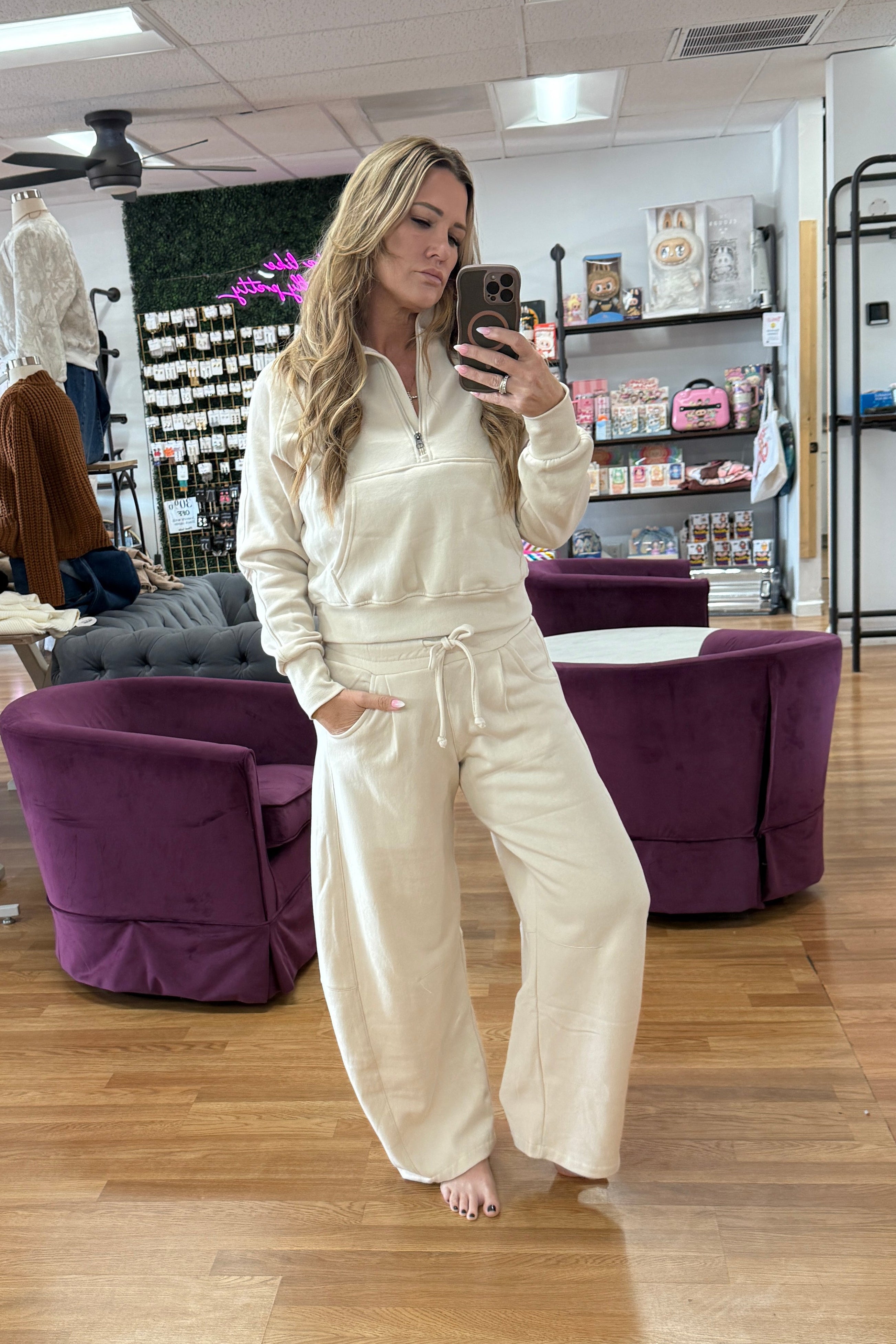Cozy up in these barrel leg sweat pants—the ultimate comfort piece that doesn't compromise on style. Featuring roomy barrel-leg silhouette, functional pockets to stash your essentials, and an adjustable drawstring for the perfect fit every time. Soft fleece construction keeps you warm and hugged all day long, whether you're lounging at home or running errands. The relaxed fit pairs effortlessly with sneakers or slides for that effortlessly cool vibe.