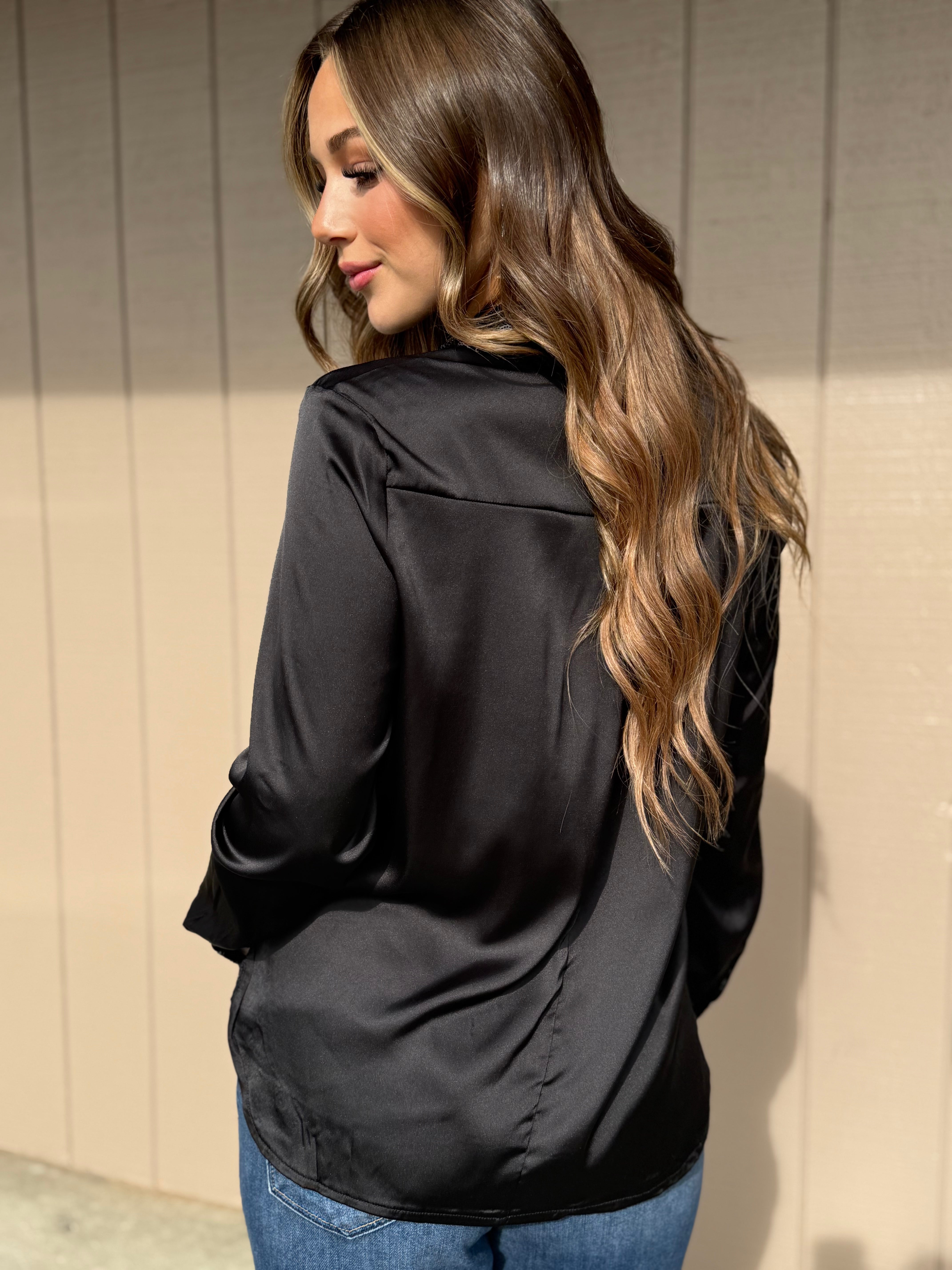 Add a touch of sparkle to your season with the All That Glitters Top. This luxe satin blouse features a silky smooth finish with shimmering sequin details along the collar and cuffs for the ultimate glam touch. The button-up front and relaxed fit make it effortlessly chic — perfect for dressing up denim or pairing with a sleek mini skirt for a night out.