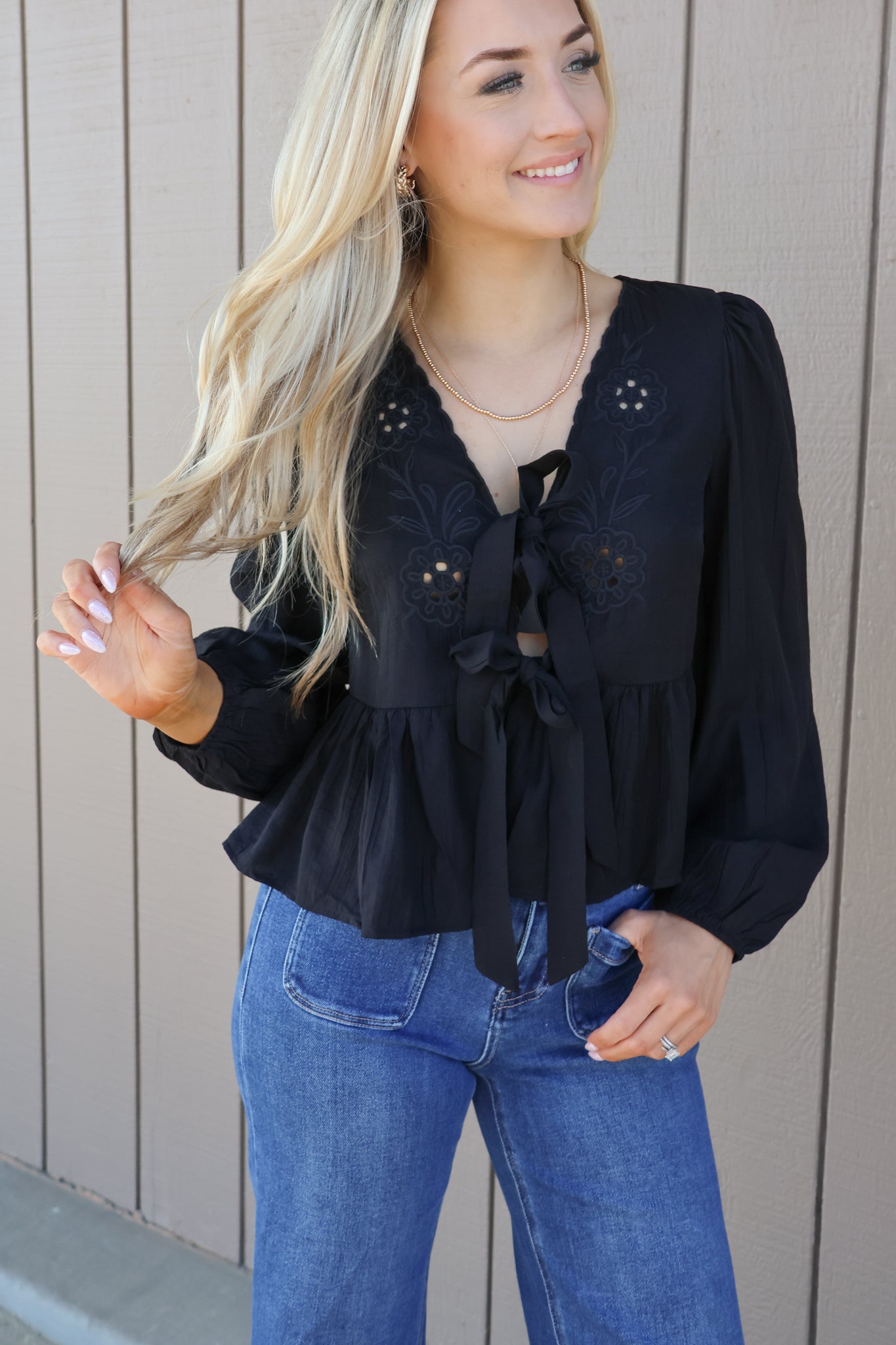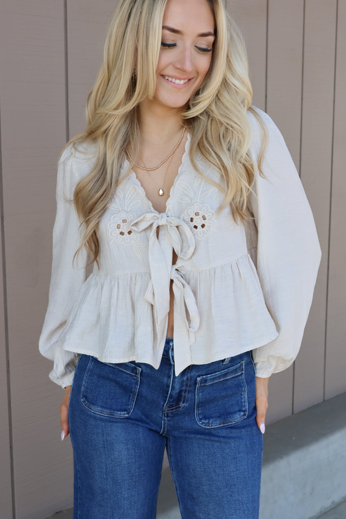 The Willow Whisper Eyelet Top is the definition of effortless boho beauty. Designed with delicate floral eyelet embroidery, a flattering front tie detail, and soft long sleeves, this romantic blouse brings an easy, feminine feel to any outfit. The lightweight woven fabric drapes beautifully, while the scalloped neckline and subtle embroidery add timeless charm.