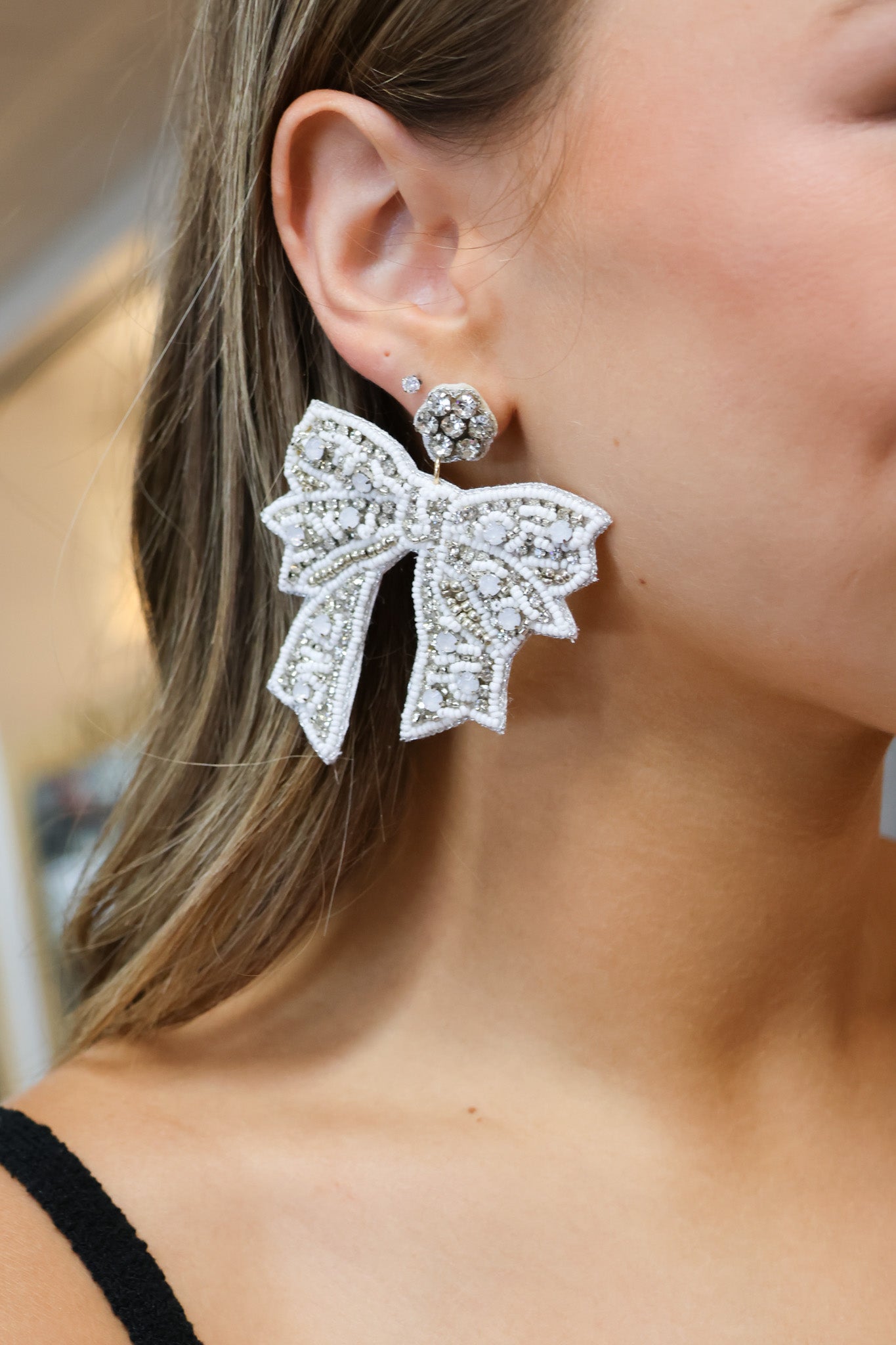 Add a touch of whimsy to your outfit with these beaded bow earrings. The white beads create a delicate yet playful bow shape, perfect for any occasion. (Bonus: They'll make you feel like a gift to the world!)