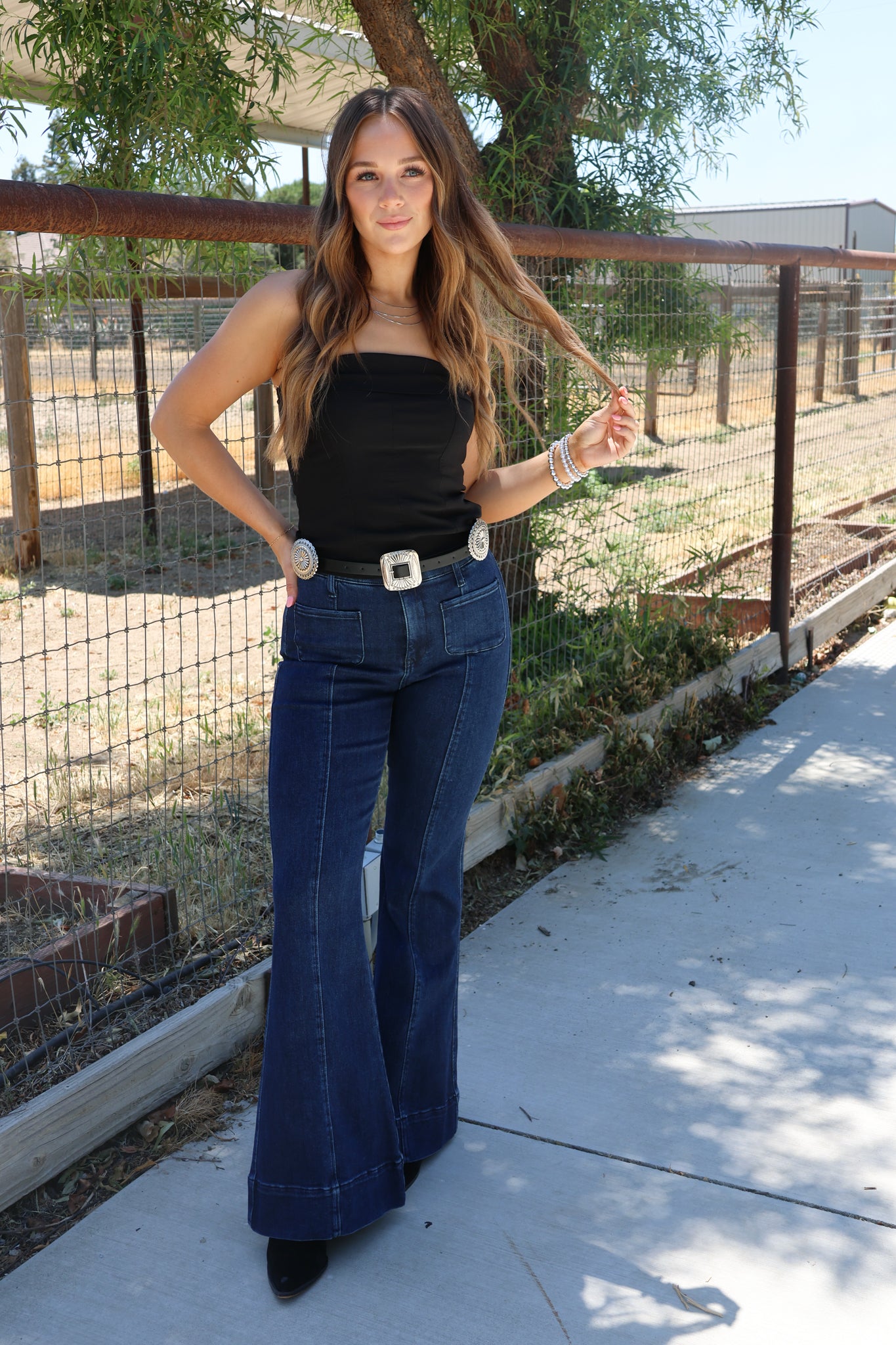 Rock a 70s vibe with these high waisted Bethany Jeans in a flattering dark wash. The super flare leg elongates your silhouette while the front patch pocket adds a touch of quirkiness. Faux back pockets keep things streamlined, and the pintuck stripe down the front adds a playful detail.