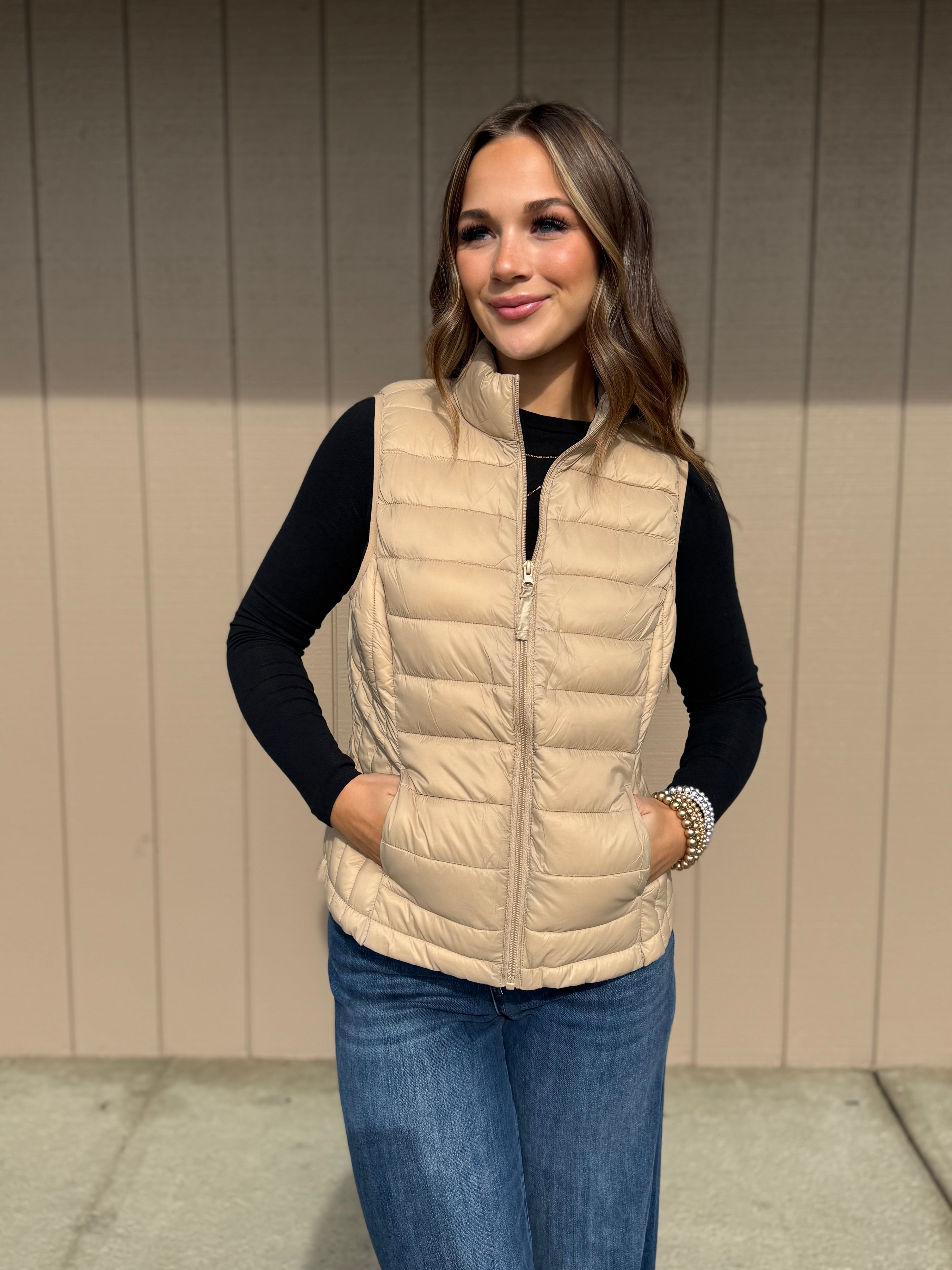 Our Everyday Essential Puffer Vest is the perfect lightweight layer for fall and winter. Designed in black, brown, and khaki, this puffer vest adds warmth, style, and versatility to any casual outfit.