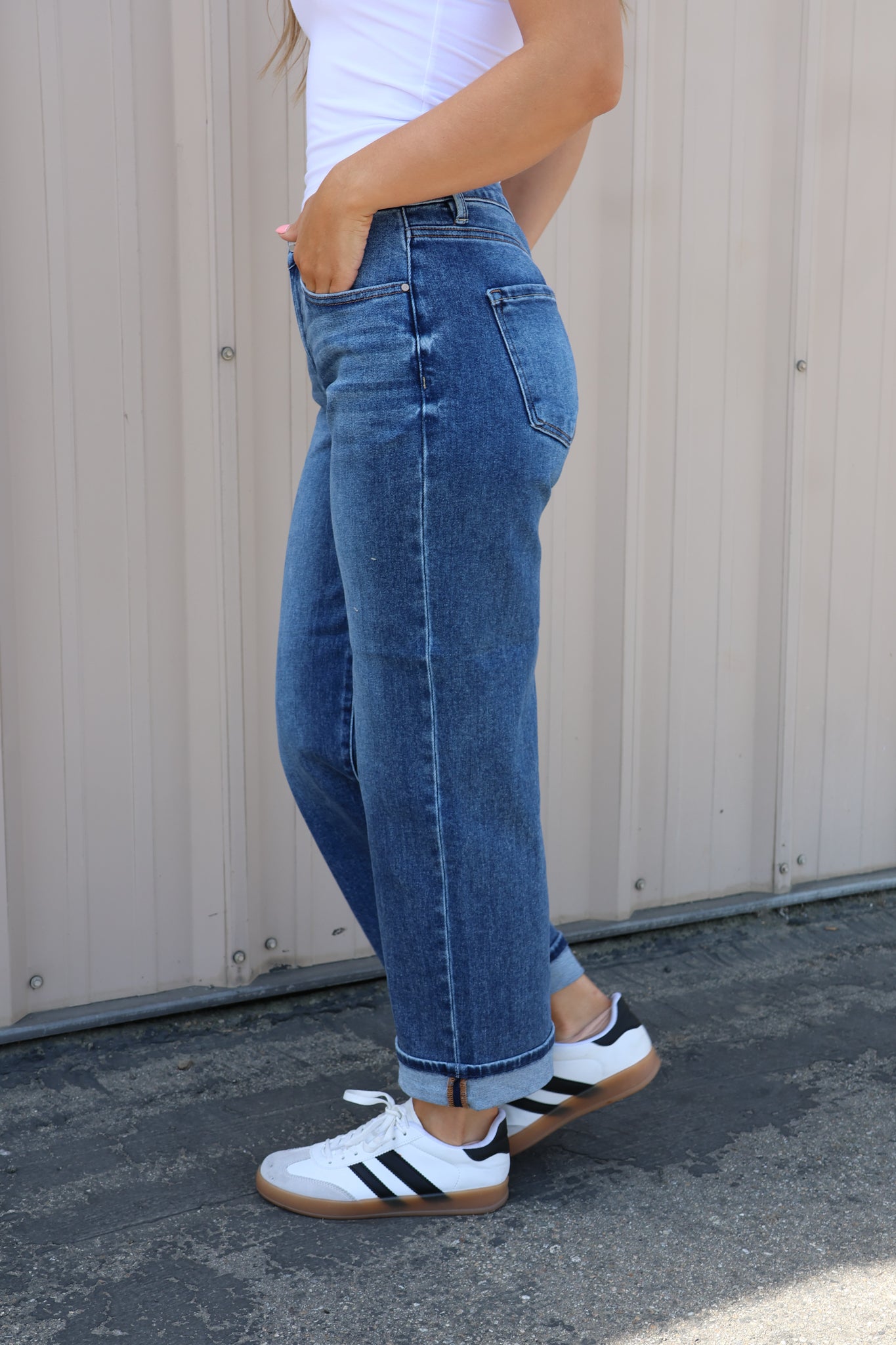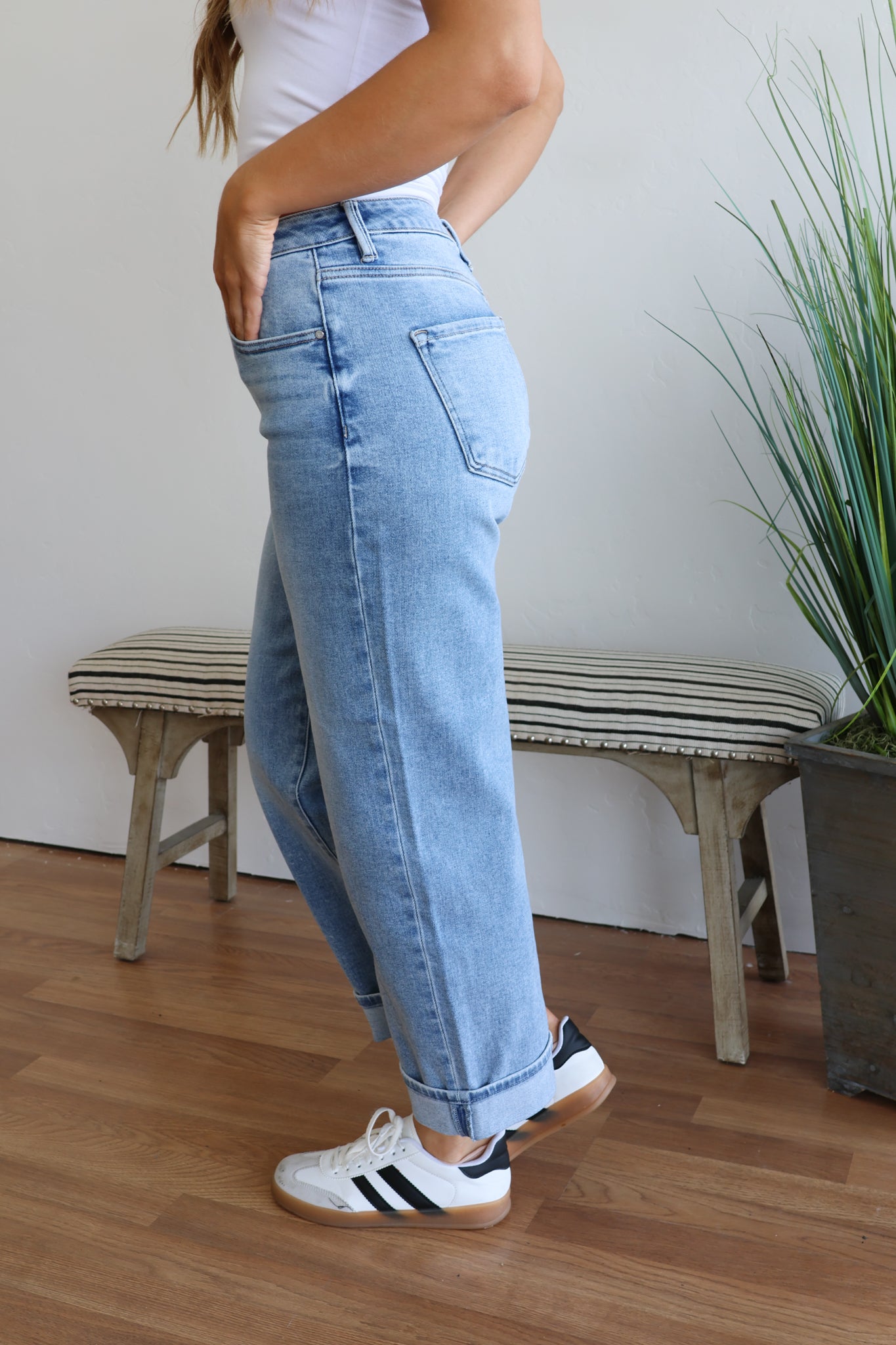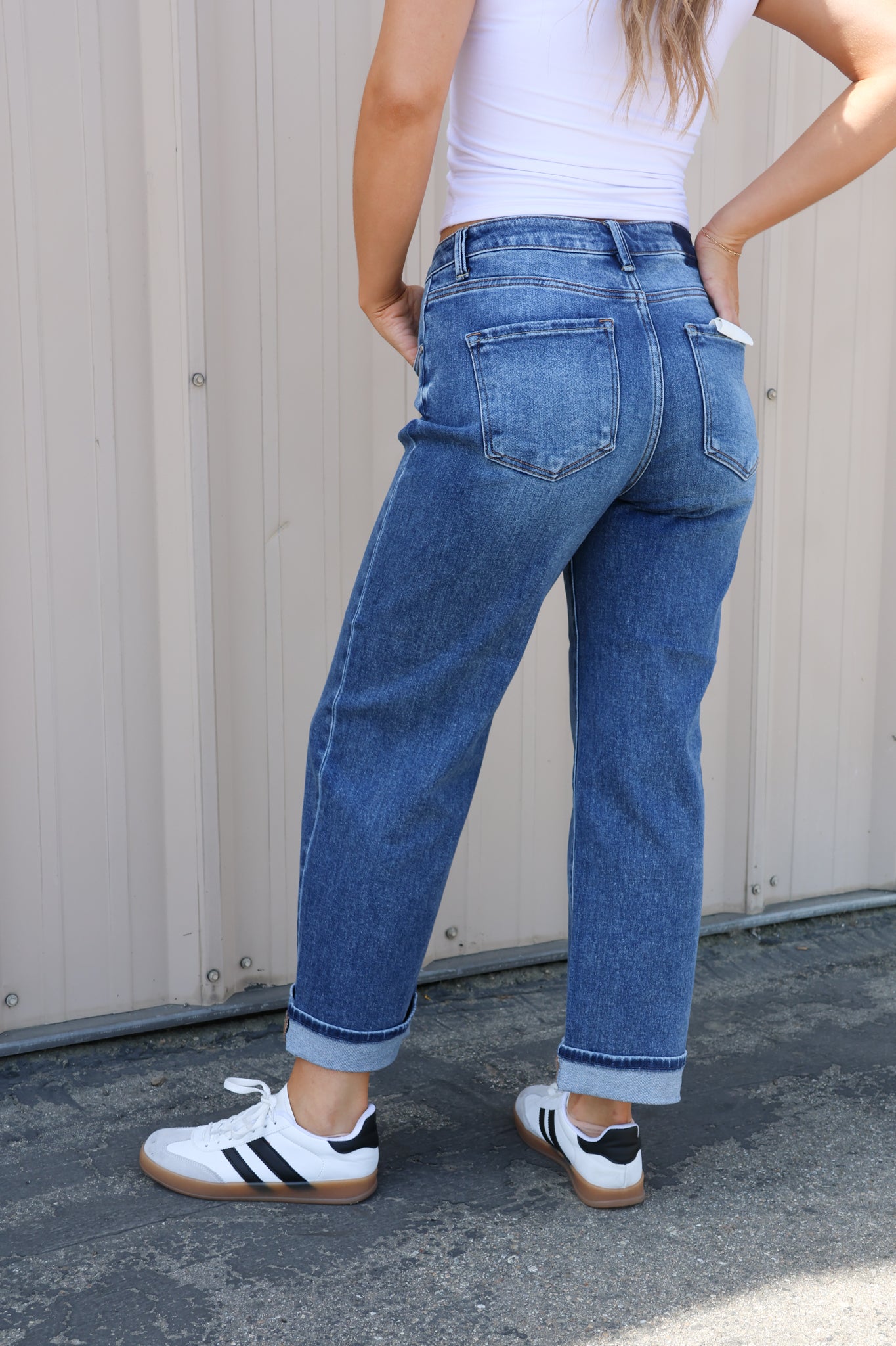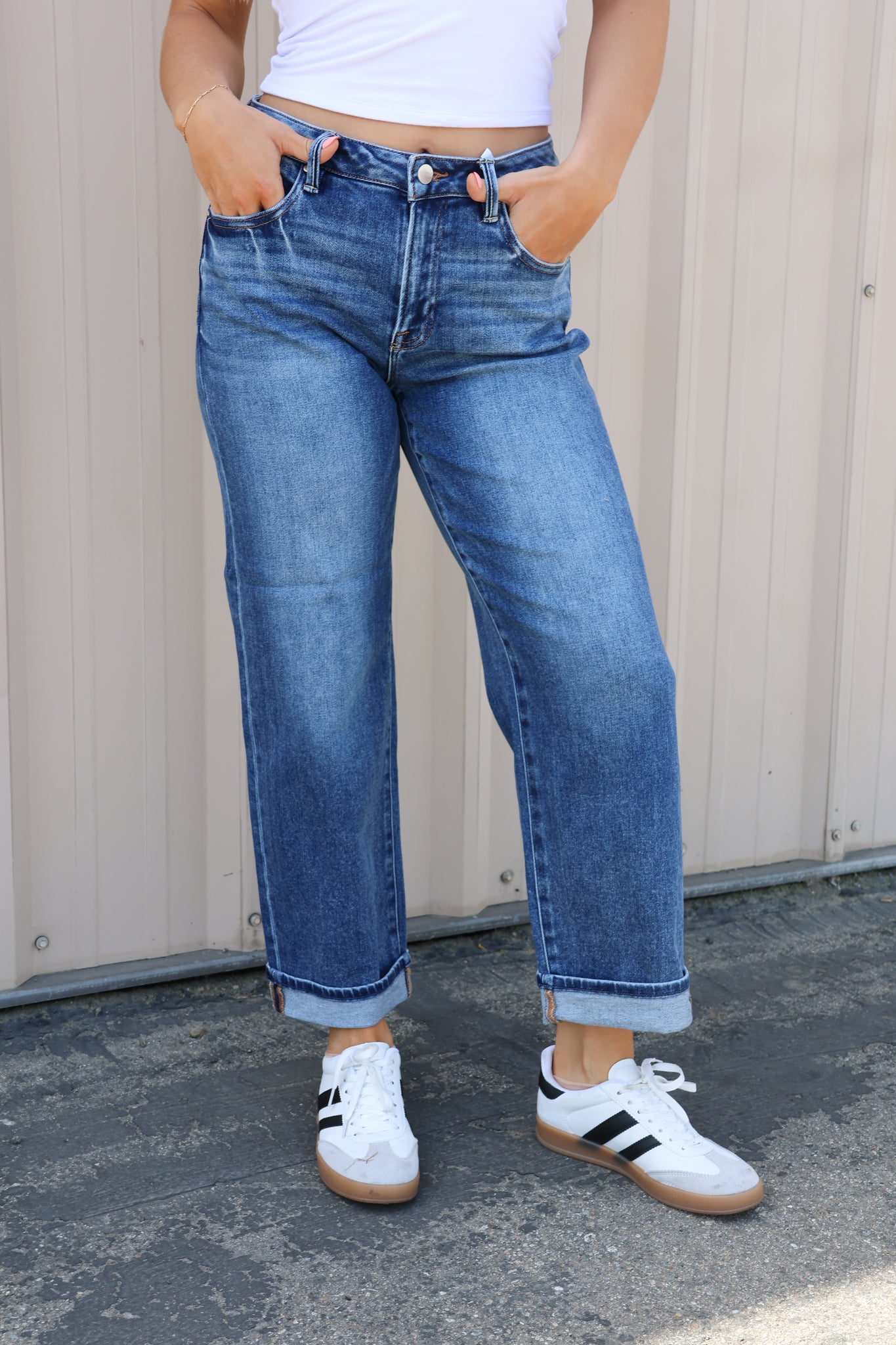Slip into effortless style with our Frankie Boyfriend Jeans. These mid-rise beauties offer the perfect relaxed fit with a flattering silhouette that doesn't sacrifice comfort. The distinctive bottom cuff adds a touch of casual sophistication, while your choice of light or dark wash ensures versatility for any outfit. These jeans will quickly become your go-to favorite for both casual days and dressed-up evenings.