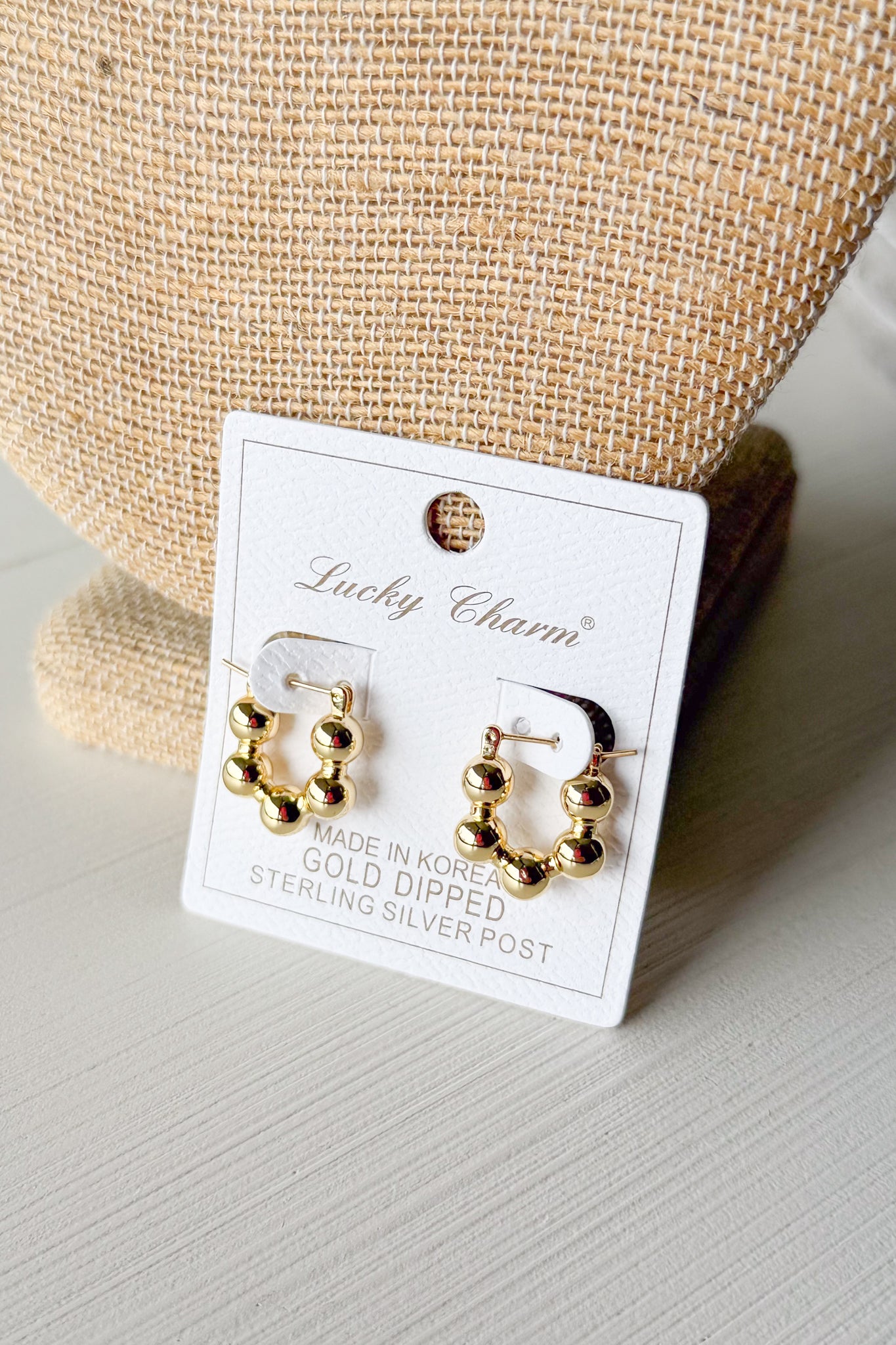 Sleek with a playful edge. These gold hoop earrings feature smooth ball detailing for a polished, modern look that adds subtle dimension without feeling overdone. Easy to style and perfect for everyday wear or dressing up your basics.