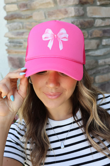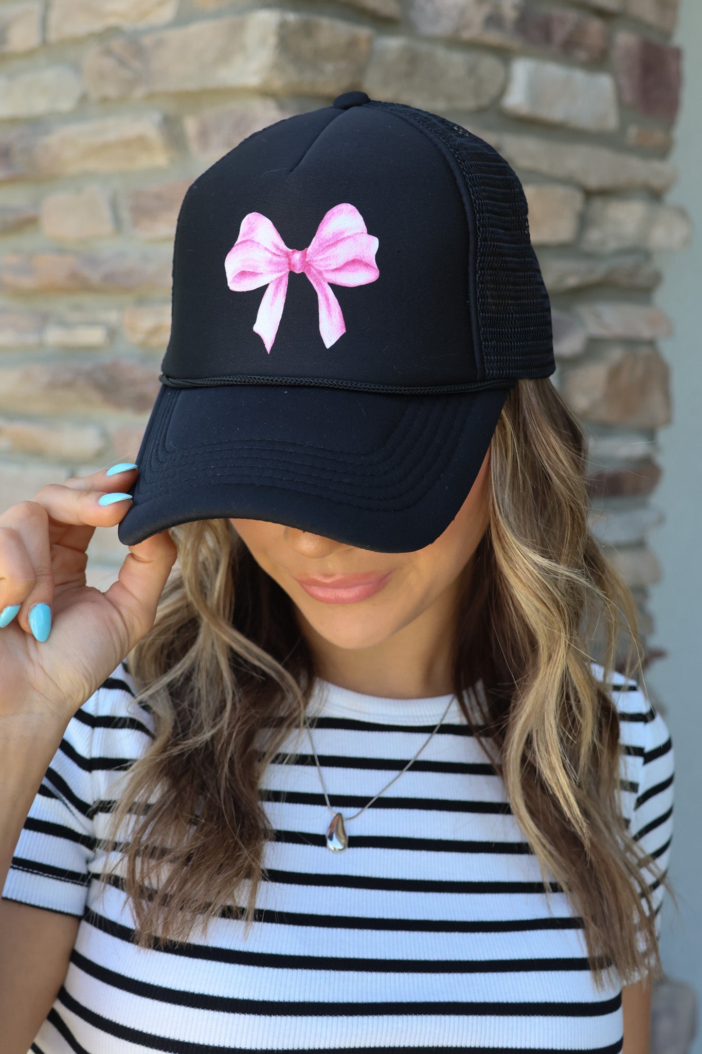 Get ready to rock your style with the It All About Bows Trucker Hat! This pink and black trucker hat features a playful pink bow for a touch of fun and quirkiness. Perfect for adding a unique twist to any outfit. No one will be able to resist asking you where you got it!
