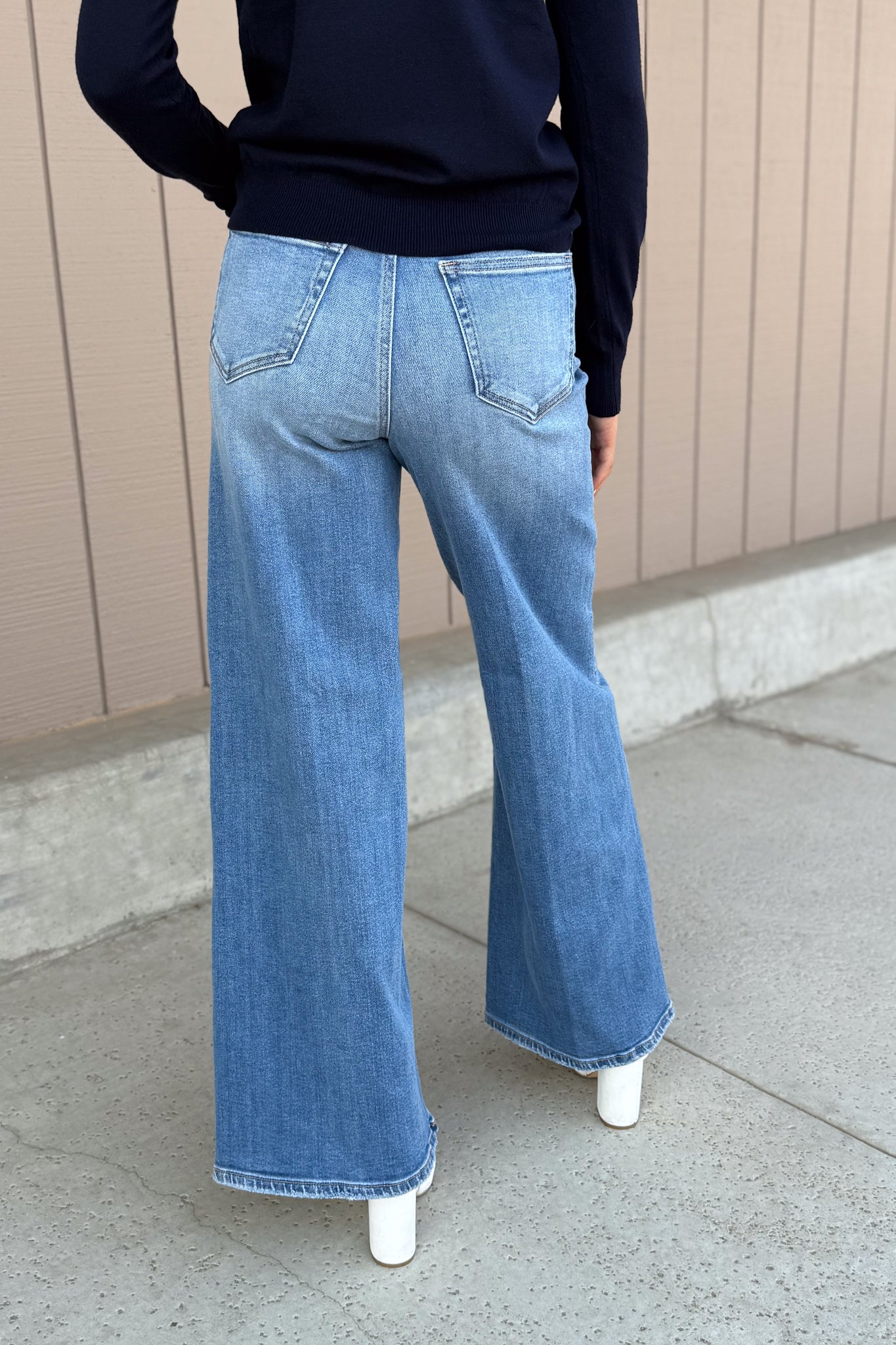 Make a statement in the Jovie Jeans, your new denim essential for effortless cool-girl style. Featuring a flattering 11 ½” high rise and dramatic 32” wide-leg silhouette, these jeans give you that laid-back yet elevated vibe that’s trending everywhere right now. Light distressing at the hip and thigh adds just the right amount of edge, while the 32” inseam makes them perfect for styling with sneakers, heels, or platforms.