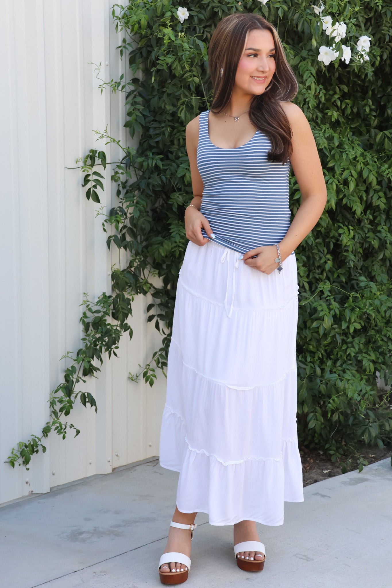 Float away in style with our Ocean Retreat Skirt in Blue! This maxi tiered skirt features a playful tie waist, perfect for a day at the beach or a night out. Slip on this versatile piece and feel like you've escaped to your own personal paradise!