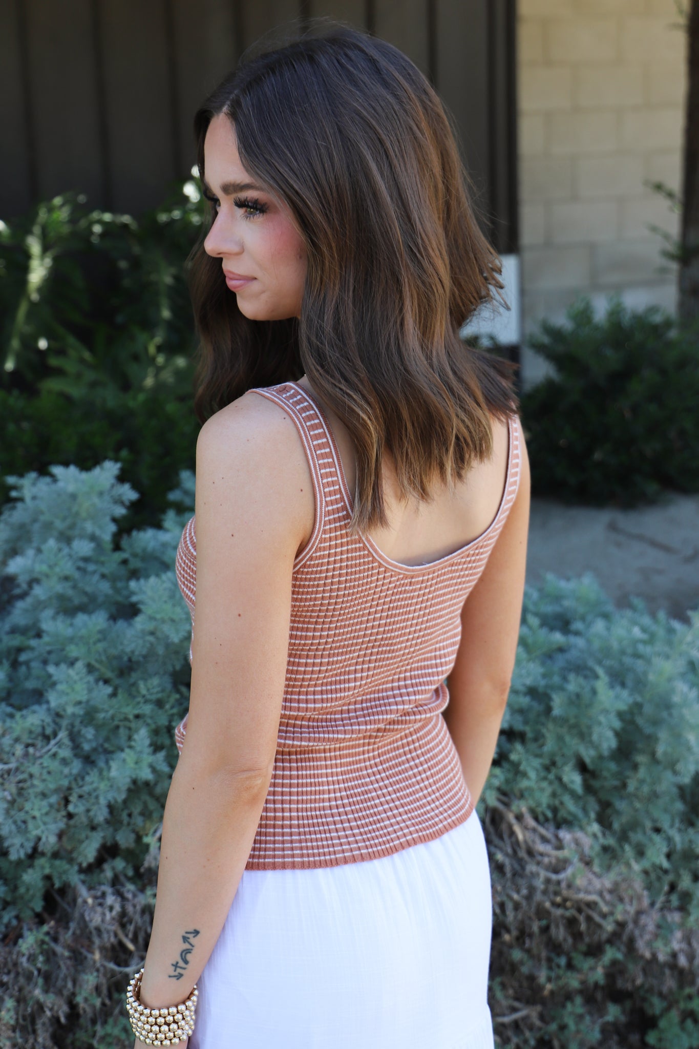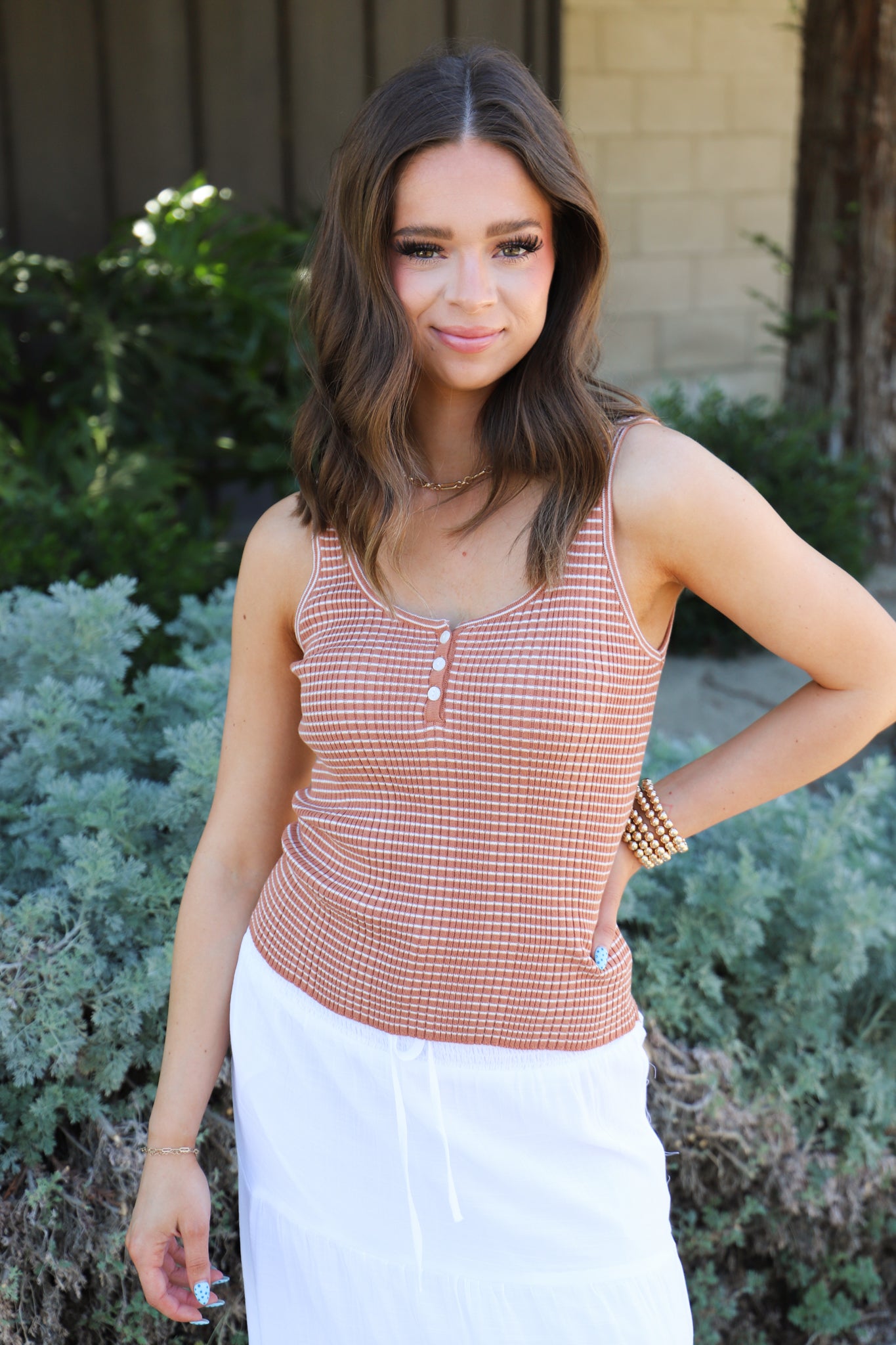Get your stripes on with our Simple Stripe Tank! This ribbed, henley style tank features a scoop neckline, making it the perfect addition to your summer casual ootd. Stay cute and cool in this must-have for the season. (Stripes never go out of style!)