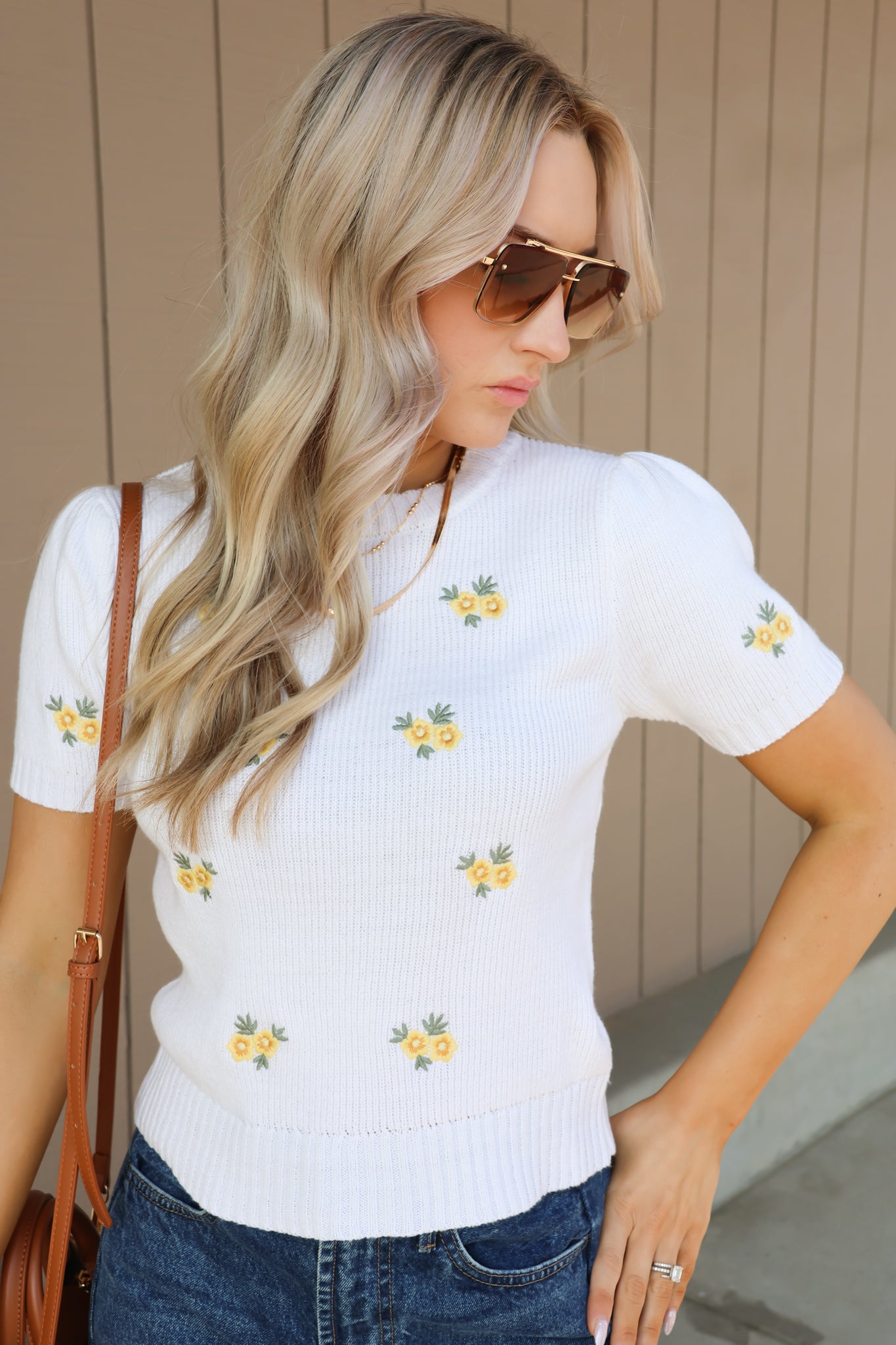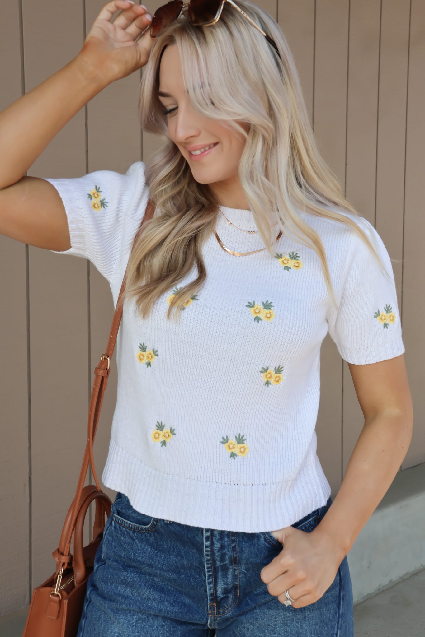 Fresh, feminine, and made for sunny days, the Fresh Picked Floral Knit Top brings effortless spring charm to your everyday wardrobe. Designed with a soft ribbed knit fabric and delicate embroidered floral details throughout, this short-sleeve sweater tee offers a flattering fit with a lightweight feel. The classic crew neckline and subtle puff sleeves add a touch of sweetness while keeping it easy and wearable.